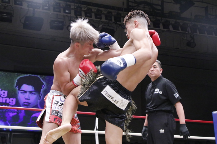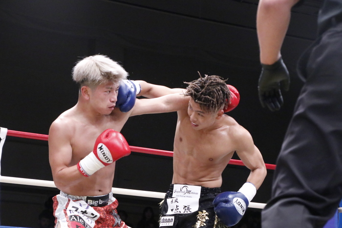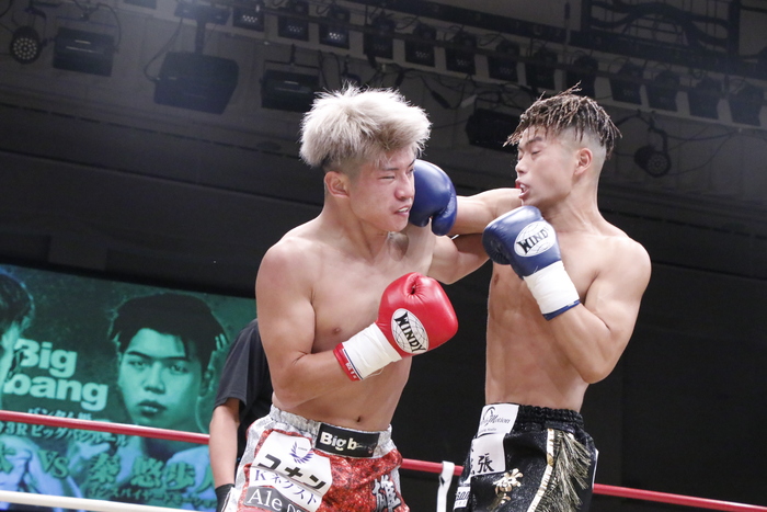 1R、秦は積極的に右を中心としたパンチで前へ出ていく。小寺は後手に回りながらも右カーフ。ジャブからワンツーを打つが小寺はバックステップ。