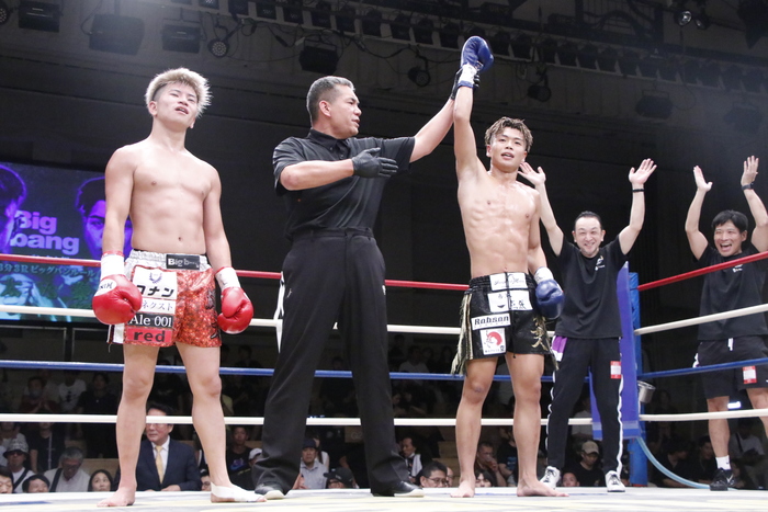 3R、右ローからの左右フックで前へ出る小寺に、秦は右の連打とジャブで応戦。手数が減ってきた秦だが右がヒットする。最後は小寺が攻めの姿勢を見せたが秦は前蹴りと組み付きで凌ぎ、判定3-0で秦が勝利を収めた。
