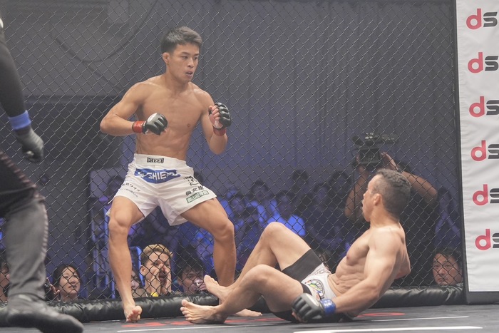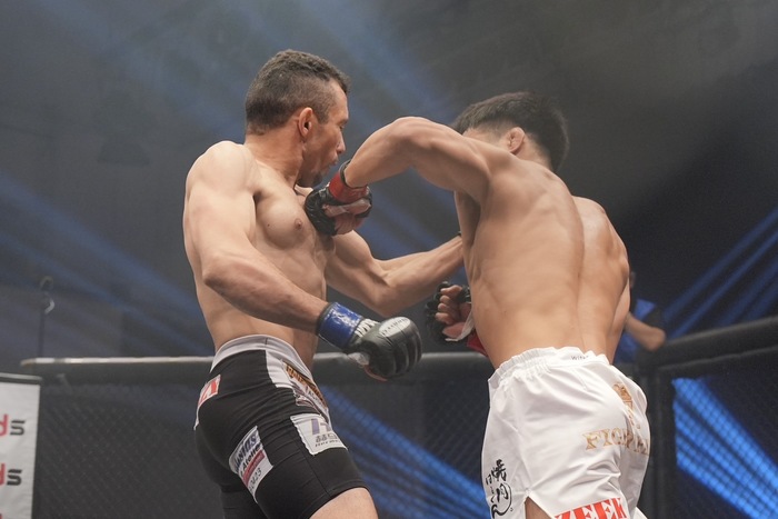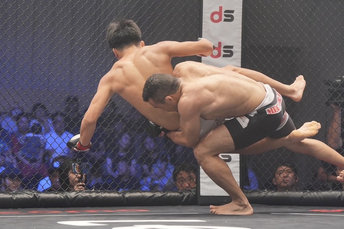 しかし組んで脇を潜るソウザはバッククリンチからボディロックテイクダウン! そこに足をかけようとするソウザにかけさせずに立つ山内は正対し、クラッチを切った際で近距離で右フック! ダウンしたソウザにパウンド連打でレフェリーが間に入った。