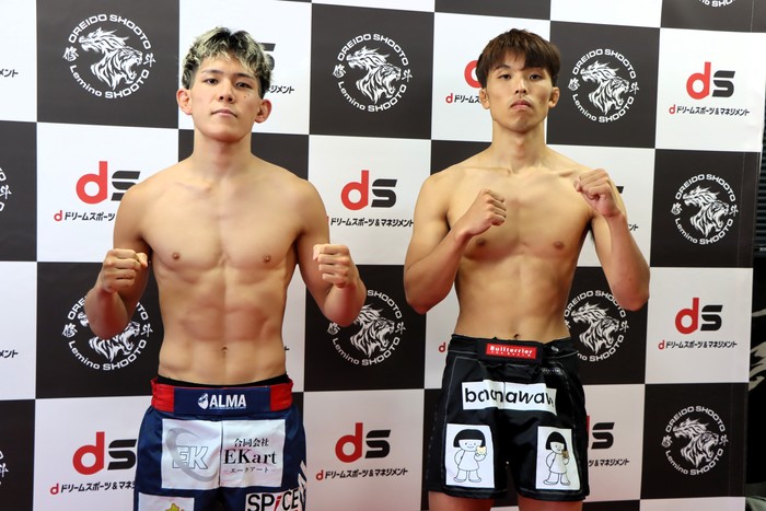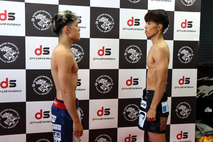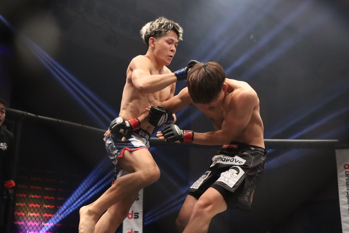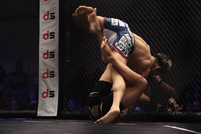 1R、ともにオーソドックス構え。左右の塚本に、下間は首相撲ヒザからダブルレッグテイクダウン。塚本はクローズドガード。