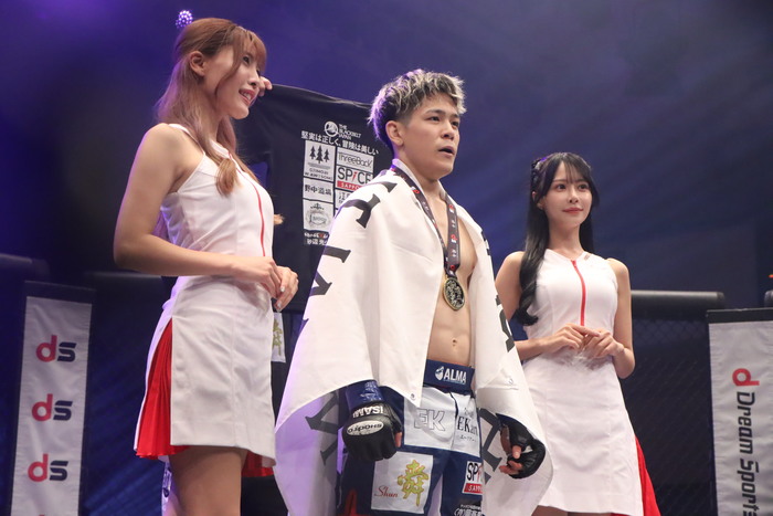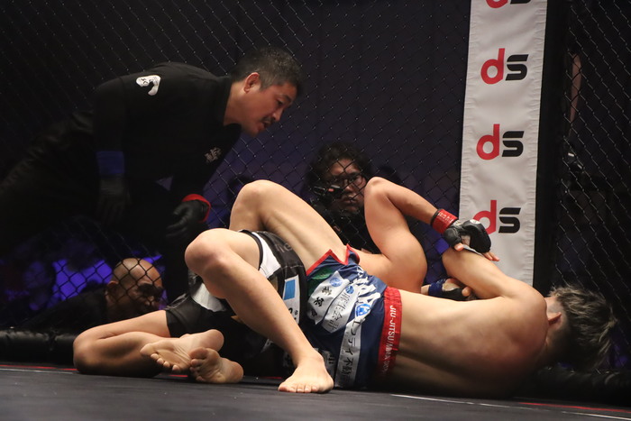 跳ね上げスイープ狙いに片足パスした下間は、パスでサイドからバックでボディトライアングル。リアネイキドチョーク。一度ははがした塚本だが、下間が組みなおして極めた。