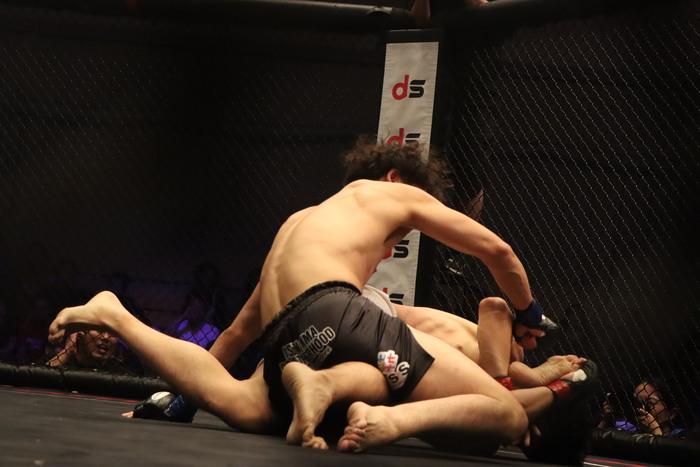 2R、辻はがぶりからアナコンダチョーク狙い。仰向けから立つゆーすけにダブルレッグテイクダウン。下のゆーすけはストレートアームバー狙いからアームロックでスイープ仕掛けるが、トップの辻。ゆーすけの立ちにギロチン狙う辻だが首を抜いたゆーすけがグラウンド状態の辻にヒザ蹴り2発で「減点1」