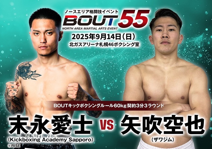 末永は5月の『RISE 188』にて藤井重綺(RISEスーパーフェザー級7位)と対戦して判定負けして以来の復帰戦。戦績は4勝(4KO)5敗。対する矢吹は5月の『BOUT 53』にてプロデビュー戦を勝利し、初のメインに抜擢された。