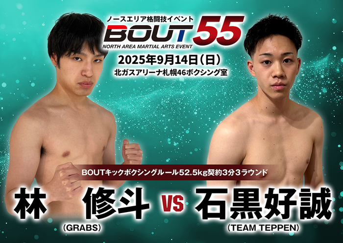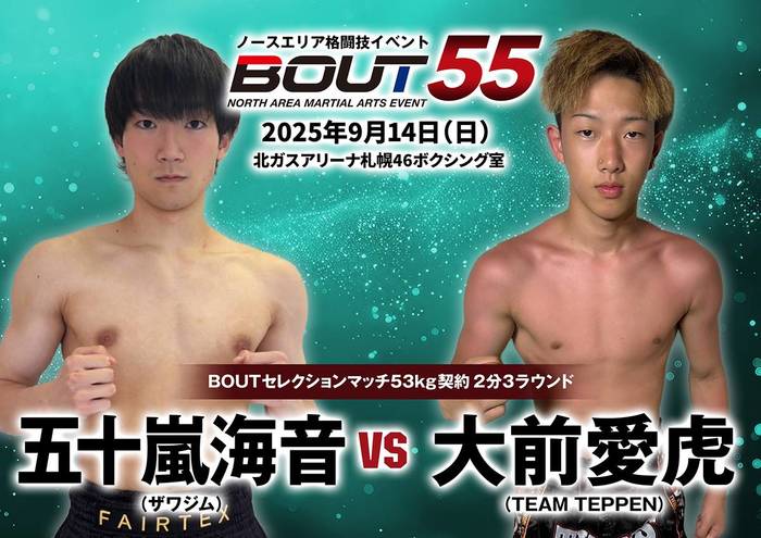 2025年9月14日(日)北海道・北ガスアリーナ札幌46ボクシング室にて開催されるノースエリカ格闘技イベント『BOUT 55』の対戦カードが発表された。