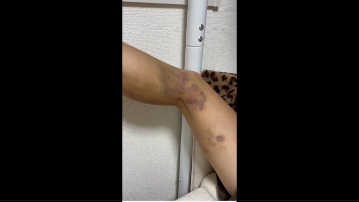【写真】ほぼ同じ個所がどす黒く変色した脚。藤原は「初めてなった」(C)藤原乃愛