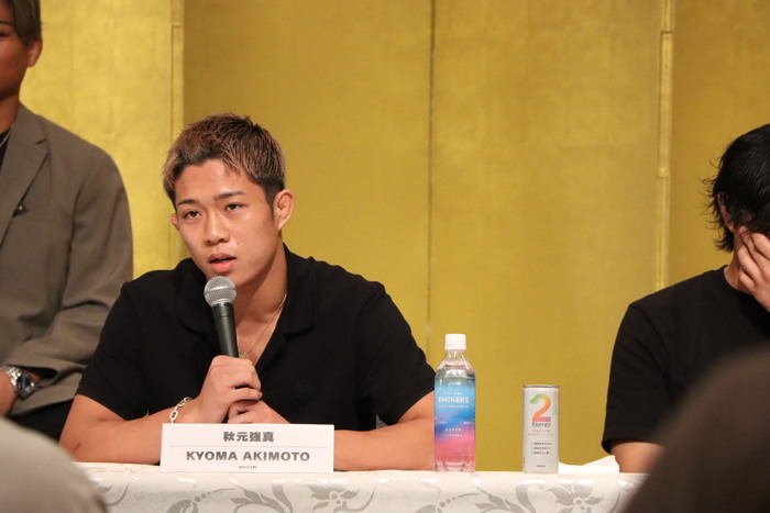 最初に秋元は「前回、超RIZINの会場で、萩原選手とやり合って決まった(カードだ)と思うんですけれど、正直レベルが違うぐらい相手にならないレベルの相手なので。未来さんとやるために秋元とやるみたいなことをYouTubeで言ってたんですけれど、そういうナメた態度で俺に挑んできたことを11月3日に、萩原選手の地元に近い神戸で恥ずかしいぐらい何もさせずにボコボコにして、その発言を後悔させてやろうと思ってるんで、皆さん楽しみにしていてください」と言い放つ。