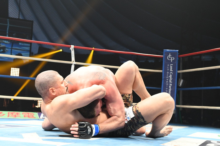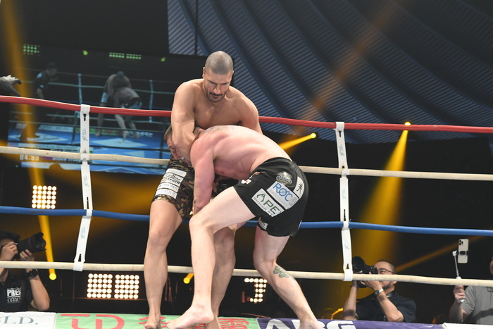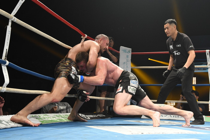 抱え込むトループ。カリミアンは抑え込みながら殴るがロープ際でドントムーブ。トループは抱え込みカリミアンのパウンドを封じる。時折パンチや鉄槌を打つカリミアン。