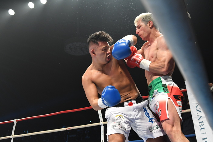 1R開始と同時にブロックを固めた山口は一気に距離を詰めて行く。最初は戸惑った様子のサッタリだったが、左手を伸ばして距離をとると左右フックの連打。被弾した山口は胴廻し回転蹴りで流れを切る。サッタリは飛びヒザ蹴り、左手を伸ばしての右フック。