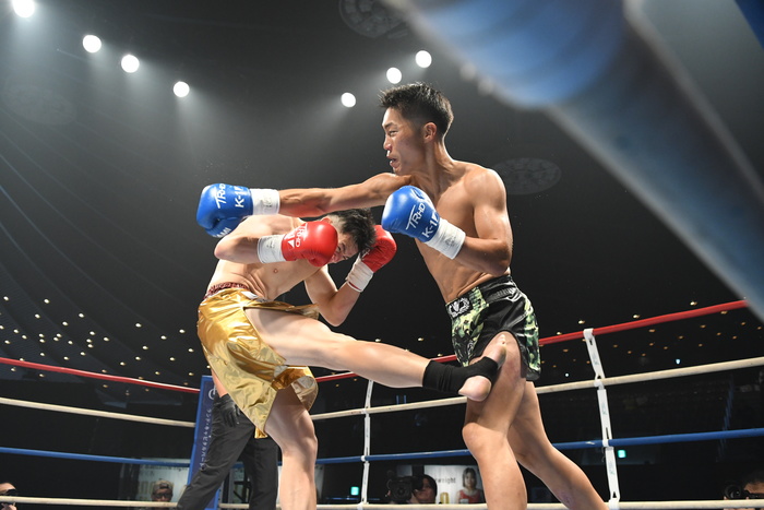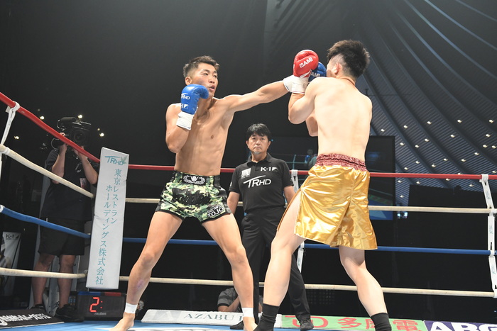 1R、TOJOは右カーフを中心に蹴りで行き、ワンツーから左ボディ。佐野は前に出てワンツーから右ロー。徹底的に右カーフを狙うTOJOへ佐野も右ローで対抗。前へ出ながら右ローを蹴り、打ち合いになるとTOJOが右ストレートをヒットさせる。打たれながらも前に出る佐野が右ストレート、右ロー。右ボディからの右ローも。佐野の右ストレートがクリーンヒットし、TOJOは大きく後方へフラつく。そこで佐野がパンチをまとめたところでラウンド終了。