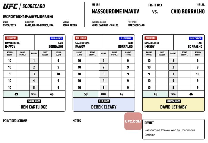 #UFCParis Official Result: Nassourdine Imavov (50-45, 49-46, 49-46 | @Imavov1) defeats Caio Borralho via Unanimous Decision.