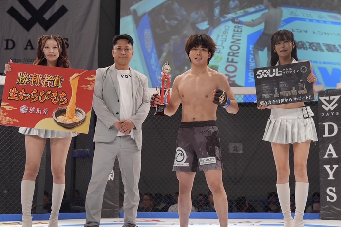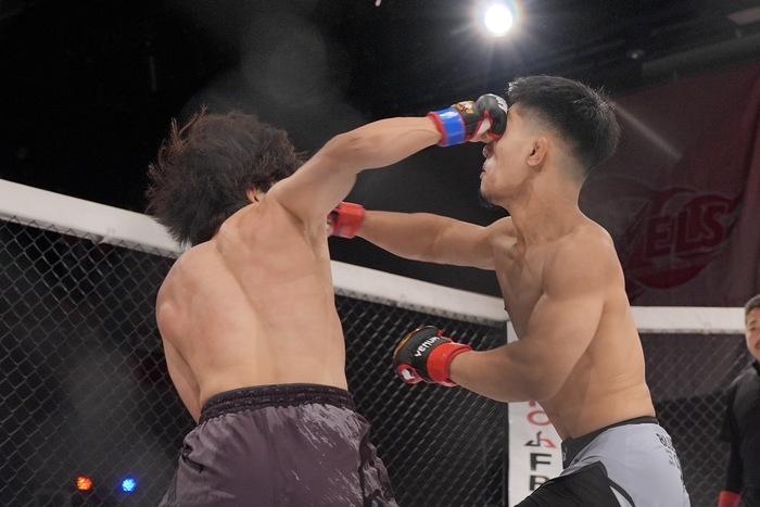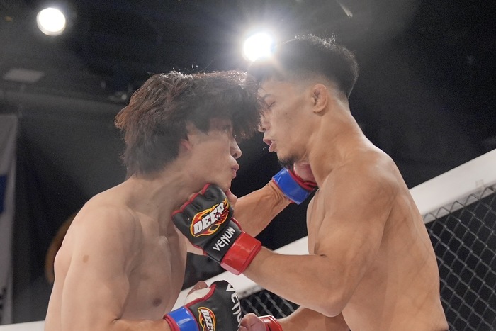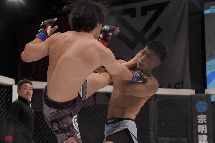生田は右アッパー、その蹴り足をつかんで詰め。ワンツーの右で飛び込む生田に、西山は詰めて右フック! 崩れた生田に背後から左フックでダウン奪い、追打でパウンドTKO勝ち。西山は3連勝をマーク。