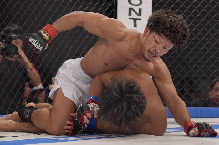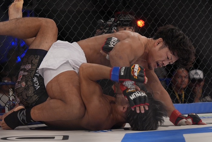 ケージウォークの安永のブリッジをかわしてマウントで両足を束ねる橋本。足を抜きハーフにする安永にケージから足を離してマウント、ギロチンチョーク。最後はパウンドに切り替えてゴング。