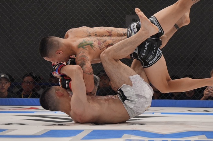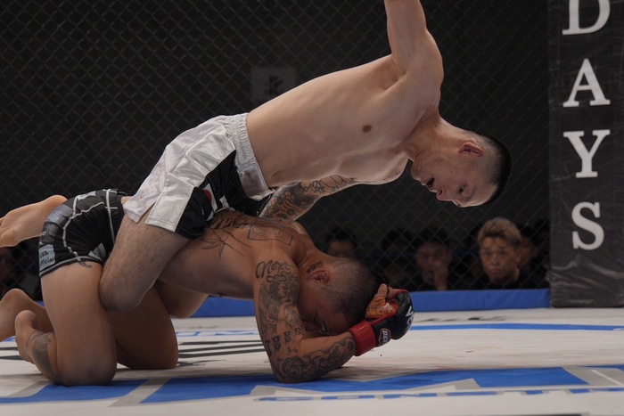 ハーフの松井は腰を切りフルガードに。ヒジを狙う横内。立ち上がり、飛び込んでパウンド。クローズドの松井は足を解くと横内の飛び込みパウンドをかわしてフックガードで跳ね上げスイープ、バックへ。