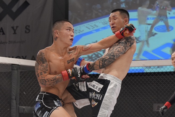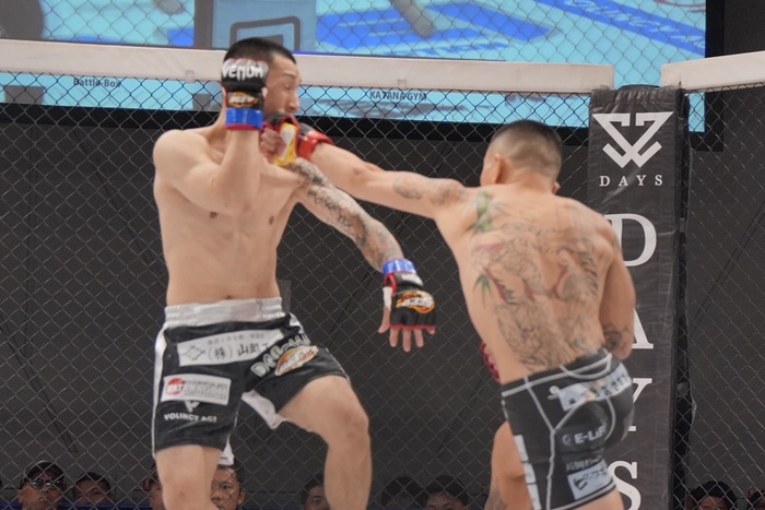 右フックで飛び込む横内をかわす松井。左目周辺から出血の横内は左ミドル、左ストレートから跳びヒザ。さらに左ストレートをかわす松井は四つに組むと、横内が小外がけテイクダウン。