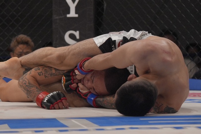 横内は脇差しで横回転で正対し上に。バック狙いの松井はここもアゴを持ち、頸動脈を絞めて松井スペシャルを極めに行く松井だが、抜ける横内がスクランブル。最後のバックの取り合いから背後からアゴを引き寄せながらのセンタク挟みも極まらず。