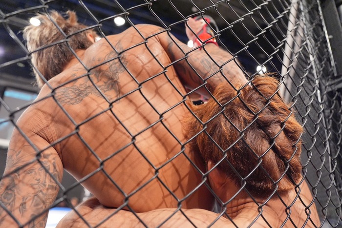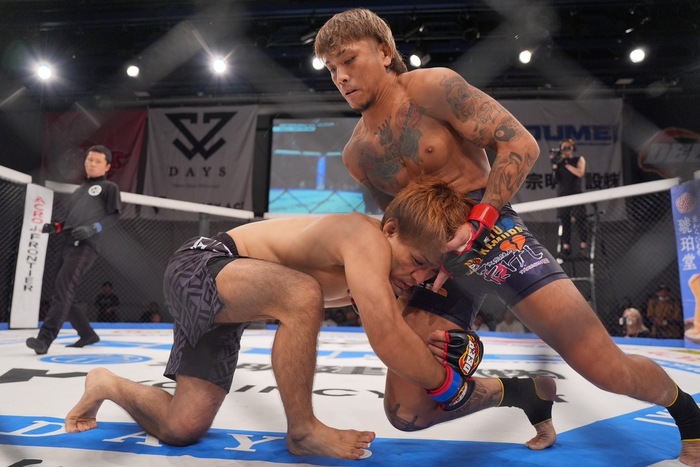 1R、サウスポー構えの松丸。オーソのナカムラは右の蹴りで圧力。右インロー。左右足を入れ替える松丸はシングルレッグも、まだ遠い。ジャブを当てるナカムラの詰めにシングルレッグの松丸は、ヘンゾロックから崩して引き込み。松丸の上に座るナカムラは背後にヒジ。さらに正対してハーフからヒジ。そのスペースで立つ松村。