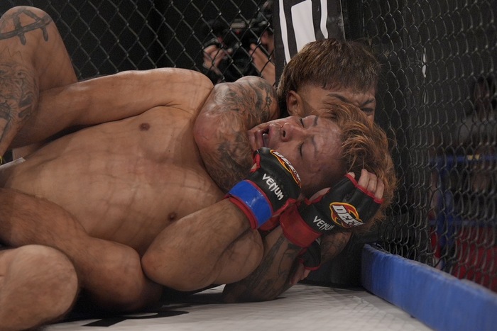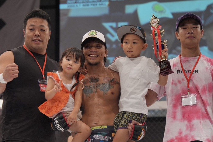 ともにサウスポー構えに。詰めるナカムラにシングルレッグの松丸。そこに右ヒジを連打するナカムラはバックに回り、リアネイキドチョーク! タップを奪った。