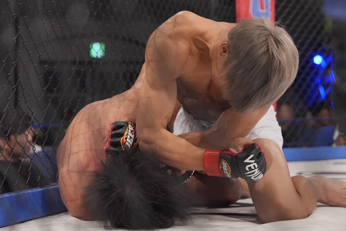 1R、左ハイから詰めて右で崩す鈴木。ハーフの今村にケージまで運び、今村に左手で潜らせずに強い右のパウンド。さらに右ヒジを打ち込み、左のパウンドでレフェリーが間に入った。