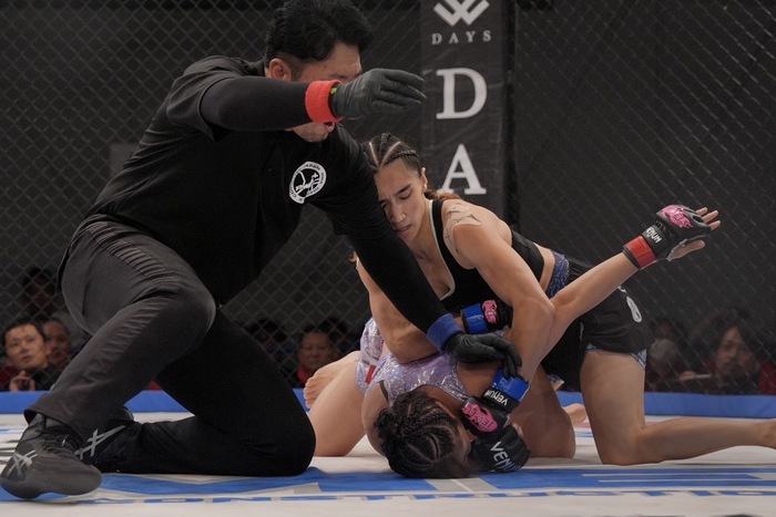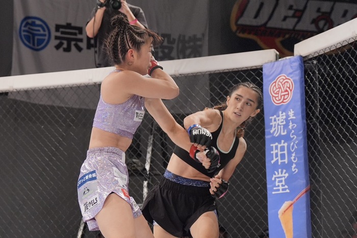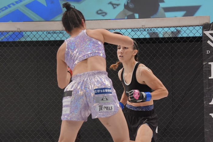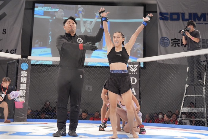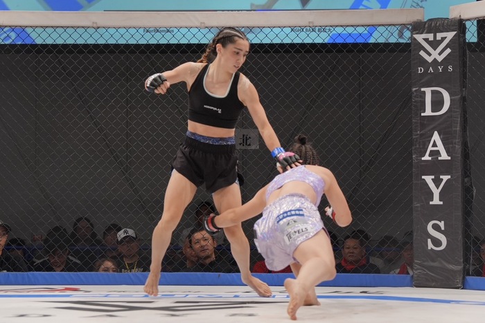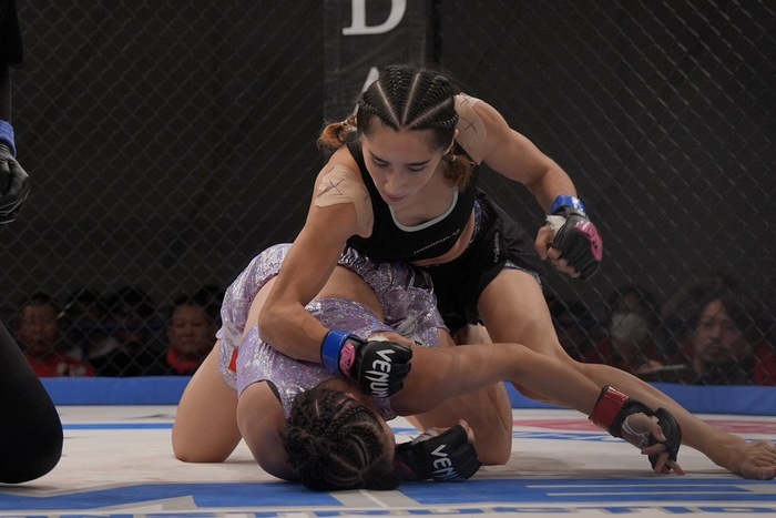 サラ「桐生選手は私がMMを知る前からプロとして活躍していて、ベテランで経験豊富でとにかくタフな相手です。だからこそ私はこの数年でどれだけ成長したかを見せるのに最高の相手だと思っています。明日はケージに上がれば相手を仕留めるまで絞め続けますので、応援よろしくお願いします」