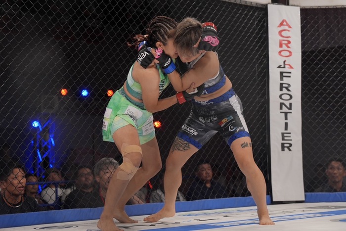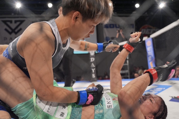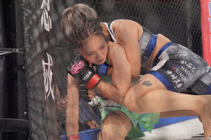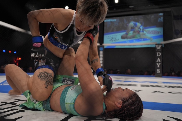 1R、右の突きの月井に、いきなり詰めて組んで右で差して投げるSAAYA。バック狙いのSAAYAに足をかけさせなかった月井が立ち上がり。正対してヒザ。SAAYAのシングルレッグテイクダウンにギロチンチョークも、首を抜くSAAYAがかつぎパスでサイドに。