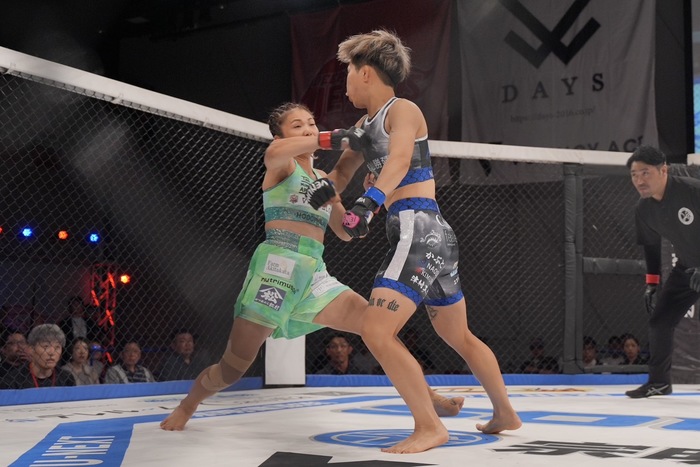 を戻す月井はフルガードに。インサイドからパウンドのSAAAYA。右足で胸を蹴り上げた月井は、左足で反則の顔面にも蹴り上げで中断。