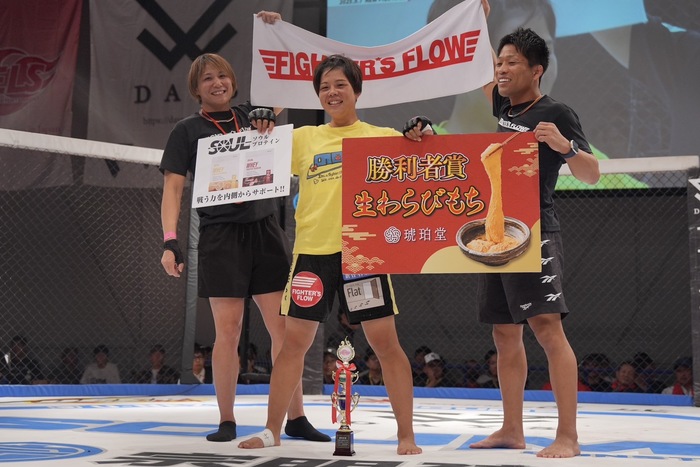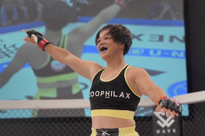 1R、ののかがシングルレッグからバッククリンチでテイクダウン。すぐさまサイドを奪うと、肩固め。堀内は両手をクラッチして防ぐが失神した。