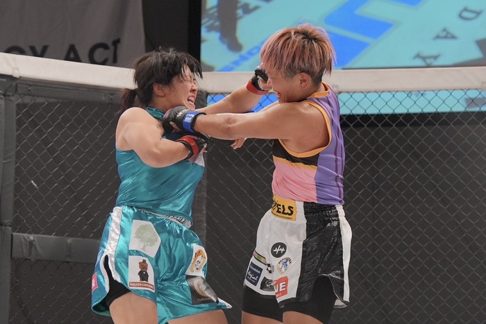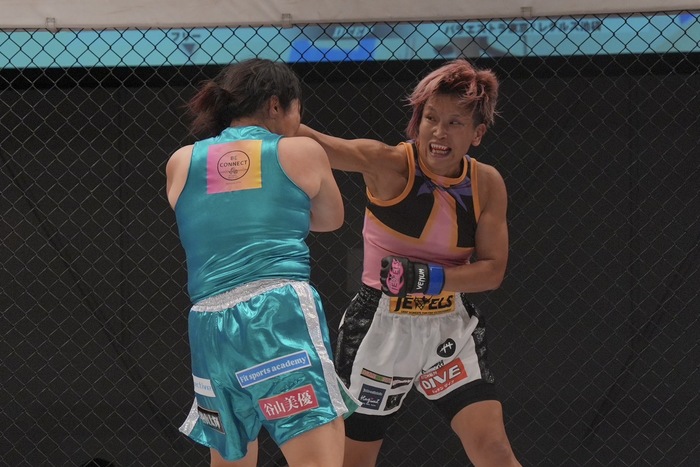 2Rも左右を振ってケージまでに押し込む谷山。ぽちゃんZはヒザケージを背にヒザ。ブレークから右ストレートを突くぽちゃんZ。谷山は左フックをかぶせに行くが。ぽちゃんZも強打を突く。