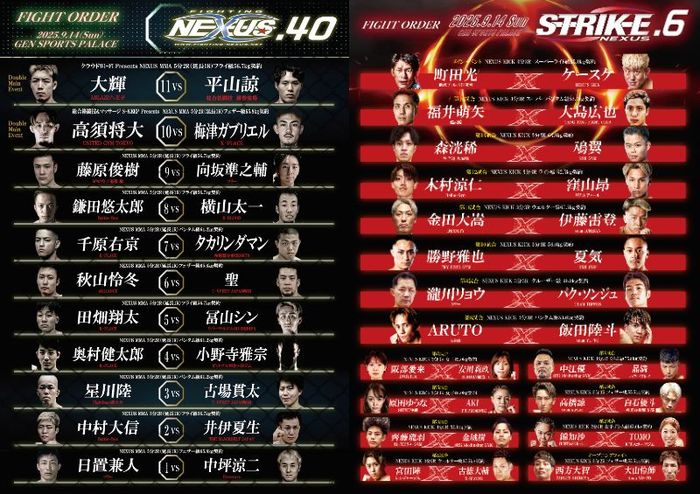 2025年9月14日(日)東京・GENスポーツパレス4Fで開催される昼大会『Fighting NEXUS vol.40』および、夜大会『STRIKE NEXUS 06』の全対戦カード・試合順が発表された。