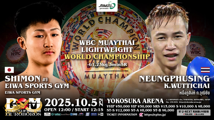 既報の竜哉・エイワスポーツジム、安部焔(ともにエイワスポーツジム)、藤原乃愛(尚武会 フジワラムエタイジム)が挑むWBCムエタイ世界タイトルマッチに加えて、WBCムエタイ世界ライト級(-61.23kg)王座決定戦で同級9位の士門・エイワスポーツジム(エイワスポーツジム)vs.ヌンプーシン・コーウィティチャイ(タイ)が決定。