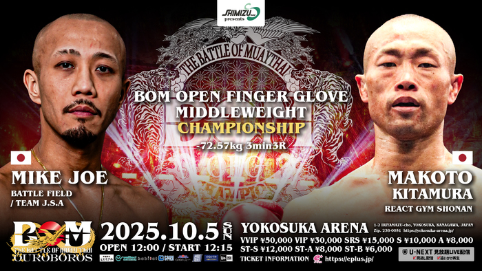 そして2本目のBOM OFGタイトル戦が決定し、ミドル級(-72.57kg)王座を懸けてMIKE JOE(BATTLE FIELD/TEAM J.S.A)と喜多村誠(REACTGYM湘南)が対戦する。両者は2度BOMのリングで対戦しており、初対決となった2022年7月のWPMFインターナショナル・ミドル級王者決定戦ではドロー。9月の再戦ではJOEが4RTKOで勝利している。3度目の対戦で勝利し、BOM OFGタイトルを獲得するのはどちらか。
