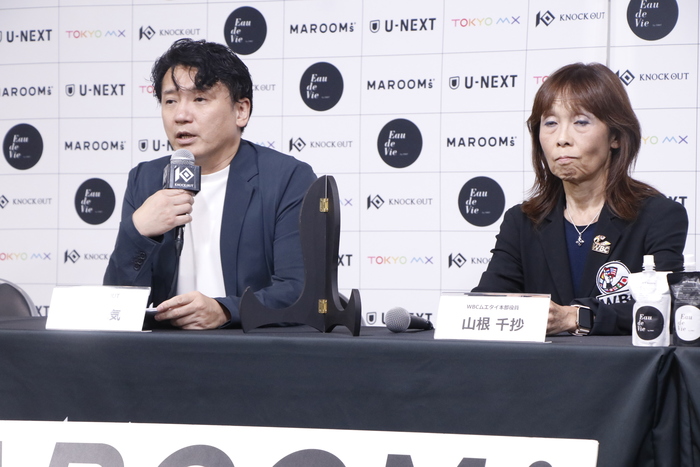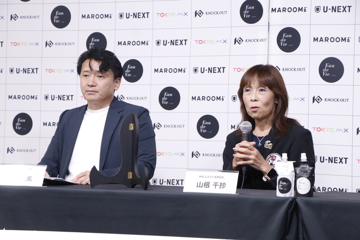 会見に同席したWBCムエタイ日本支部(会長:藤原敏男)事務局の山根千抄(WBCムエタイバンコク本部役員)氏は、「WBCムエタイ日本支部は改革を進めています。KNOCK OUTからも日本タイトル戦をとの話があってありがたく思っています。私が今後やることは日本人選手たちを海外に挑戦させて、世界王者を作って行くのが私の使命だと思っております。その第一歩として8月に撫子選手が世界王座を獲りました。WBCは2024年に世界48カ国で174試合行われています。世界の中でも例を見ない認定組織です。日本の中でも活性化して世界ベルトを獲れるようにしてもらいたいです」と挨拶。