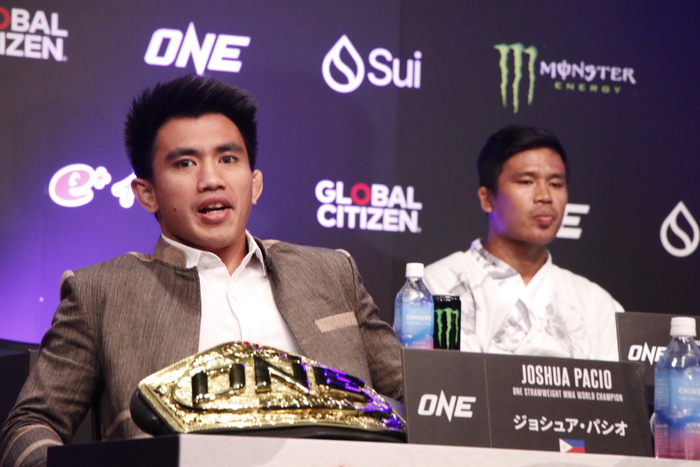 7月22日にONEフライ級(※61.2kg)MMAタイトルマッチ5分5Rで対戦することが発表された、王者・若松佑弥(TRIBE TOKYO MMA)と挑戦者でONEストロー級(※56.7kg)王者のジョシュア・パシオ(フィリピン/Lions Nation MMA)が会見に出席。