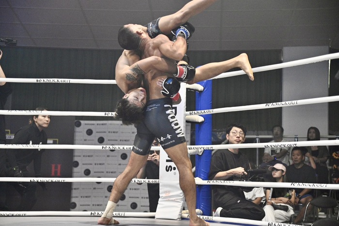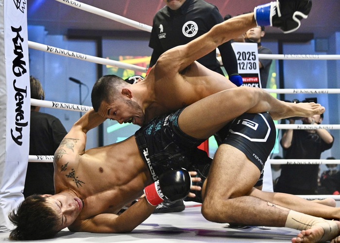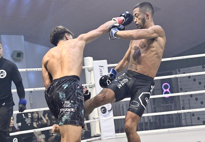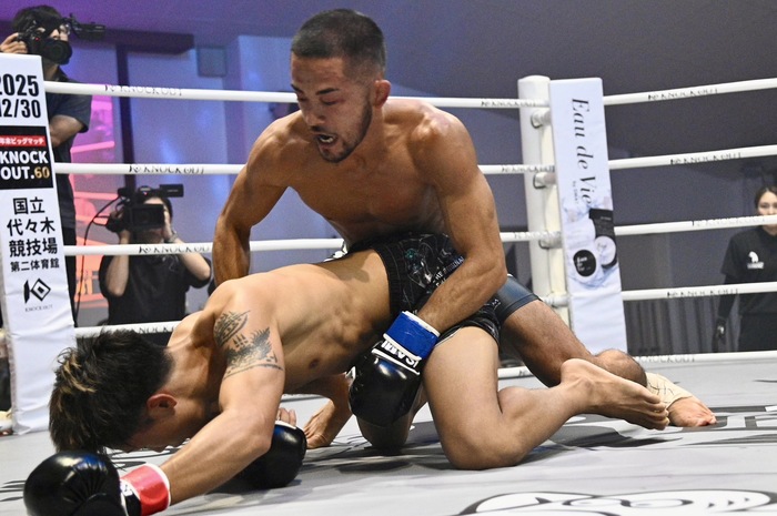 1R、両者広いスタンスから蹴りを出し合う中、前田がダブルレッグに行ったが福田がかわす。右カーフを蹴っていく福田に前田がダブルレッグでテイクダウン。すかさずパウンドを打ちに行く。立ち上がろうとする福田にサッカーキック。立ち上がった福田が右ストレート、前田がすぐにダブルレッグでテイクダウンした。
