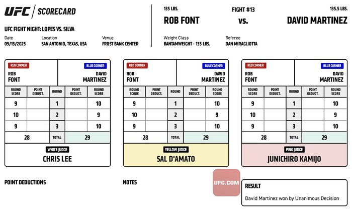 #NocheUFC Official Result: David Martinez (29-28, 29-28, 29-28) defeats Rob Font via Unanimous Decision.