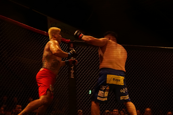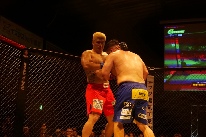 四つで左で差す荒東。ブレーク。右回りで右ジャブ、左ローを突くベ・ドンヒョンは右ローも。追う荒東に左前蹴りも腹に突く。荒東の詰めにヒザを突くベ・ドンヒョンだが、右で差して押し込む荒東。ケージ背にするベ・ドンヒョンは左で頭を抱えこつこつ叩き。荒東のシングルレッグを切って体入れ替え。差して体を入れ替えた荒東は両差しからクラッチして引き出そうとするが、細かいパンチを突くベ・ドンヒョンが残してヒザ。荒東の強引な払い腰を切る。荒東は右で差して押し込み細かいパンチを腹に。