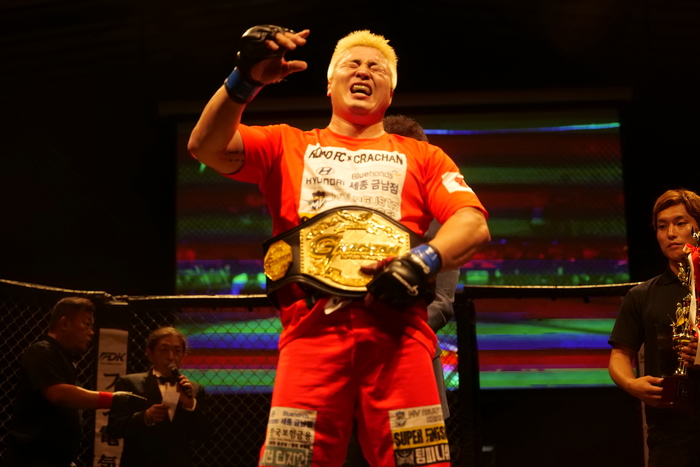 ヒジを落として左右鉄槌連打! レフェリーが残り1秒で間に入った。ベ・ドンヒョンが3R 4分59秒 TKO勝ち。GRACHANヘビー級新王者に。