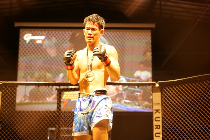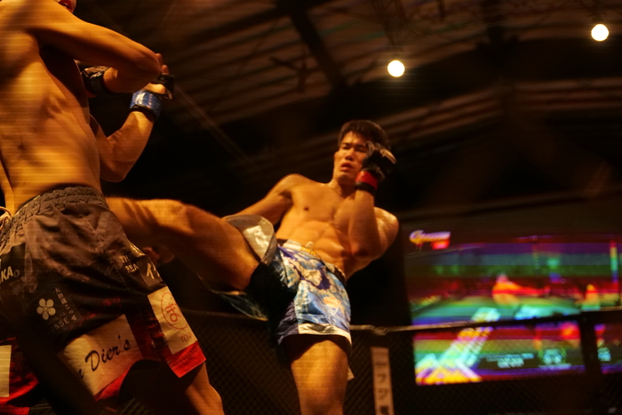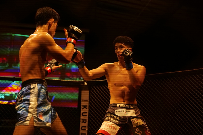 右ストレートを突いて組んでヒザの高橋。右フックで押し返す大搗に、ミドルを返した高橋が、シングルレッグでテイクダウンしてホーン。