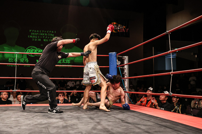 なんとか立ち上がってきた龍太郎だったが、ダメージが残っているのは明らか。松本はハイキックでグラつかせると、再び右フックを浴びせ2度目のダウンをとる。