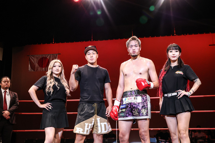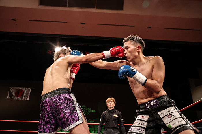 打ち合いの中、左のテンカオで榎木の顔面をカット。その傷口は想像以上に深く、リングドクターは試合のストップを宣言した。3R57秒、祐基の逆転TKO勝ちだ。結果的に祐基が勝負強さを見せた一戦となった。挑戦者決定トーナメント決勝は12月14日のDEEP☆KICK76で組まれる。