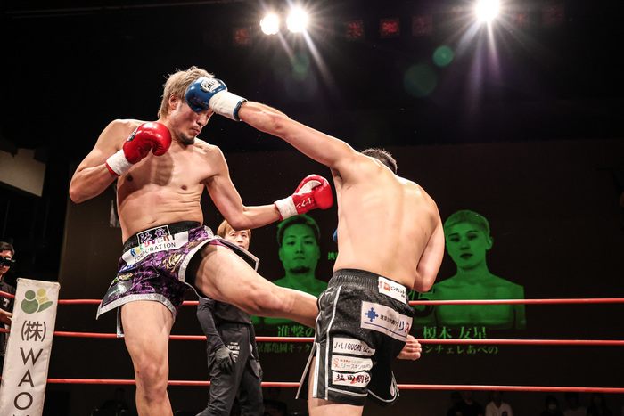 公式プロフィールだと進撃の祐基との身長差は5㎝ながら、リング上で対峙するとそれ以上あるように映る。しかしながら榎木はそんな差など感じさせることなく、サークリングしながらチャンスと見るやミドルやローを当てていく。