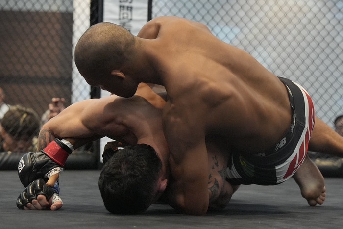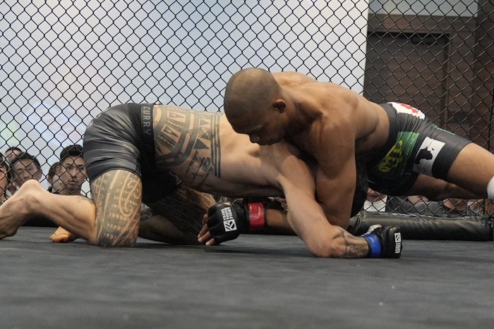 2R、ジョブリンのシングルを切るエフェヴィガ。ダブルレッグにヒザを合わせるもすぐに追って組むジョブリンをケージに押し込む。左の首ネガを狙ったジョブリンに首抜き離れたエフェヴィガ。ジョブリンの入りに左ボディ!