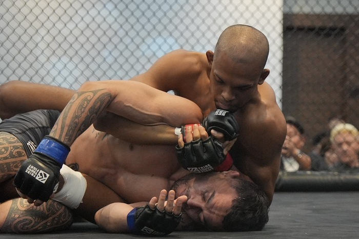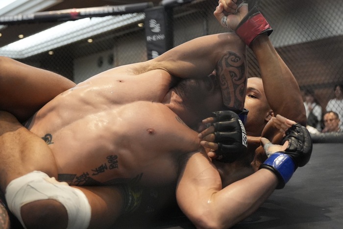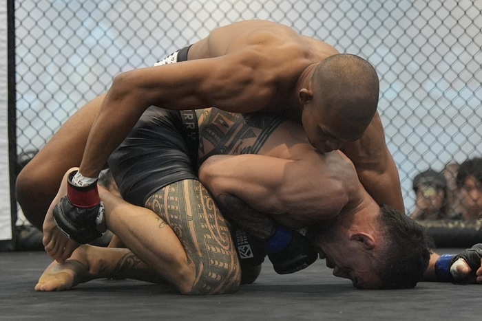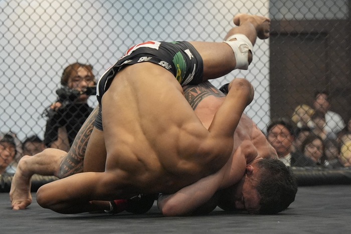 1R、サウスポー構えのエフェヴィガ。オーソのジョブリン。右ジャブを伸ばしたエフェヴィガにシングルレッグを狙うジョブリン。しっかり切るエフェヴィガはサイドバックに。腕を巻き込むジョブリンはキムラ狙いも、そこにマウントを合わせたエフェヴィガはバックからボディトライアングルいに。