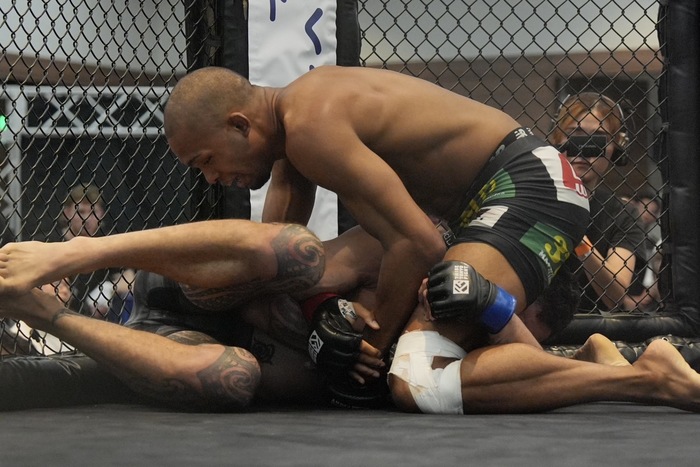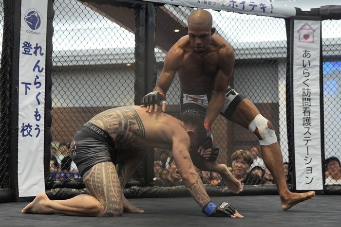 効かされたジョブリンが崩れたところにパウンドのエフェヴィガ。ジョブリンは腹ばいからヒザを立てて立ち上がり。体を入れ替えようとするジョブリンに離れる。