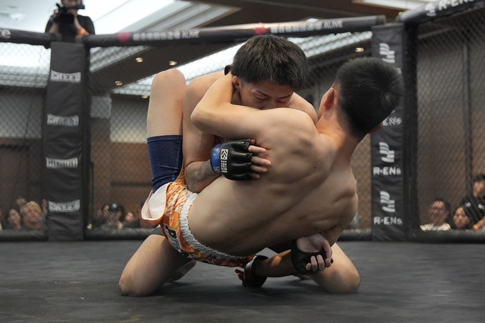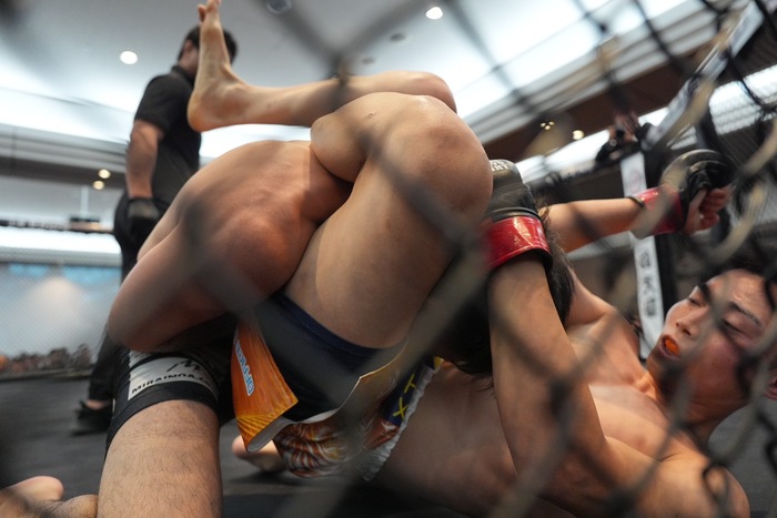 離れた宮川に、上田は打撃の間合いを作らせずダブルレッグから引き込み。クローズドガードの上田は左で首を抱えるが、宮川は首抜きパウンドから離れる。宮川のラウンドに。