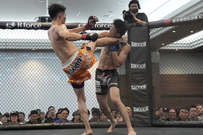 延長R、ワンツーから右ハイの上田は、近づくと引き込みに。宮川は上田の頭をケージに押し込み、インサイドから脇腹に細かいパウンド。