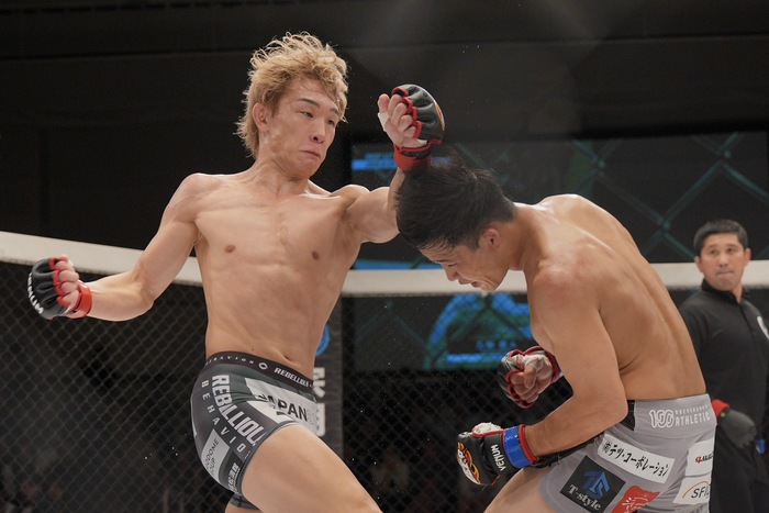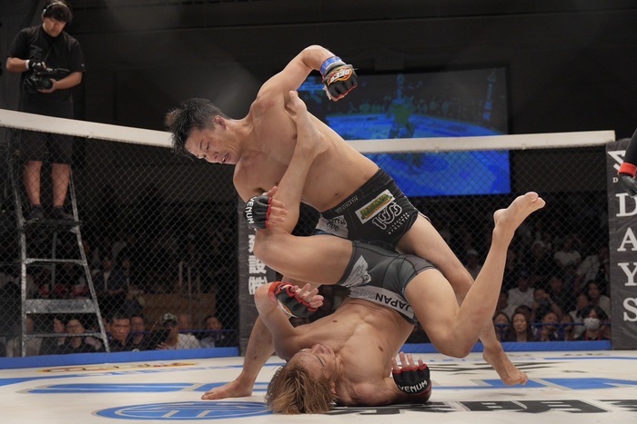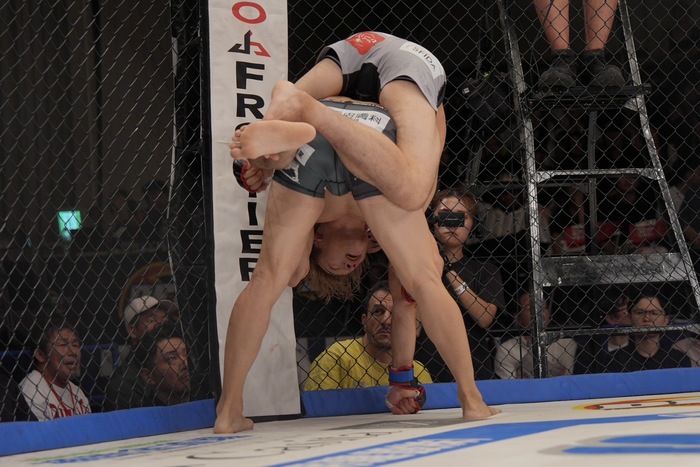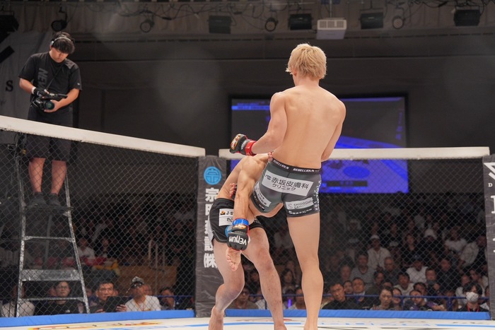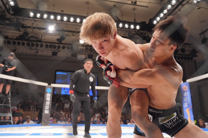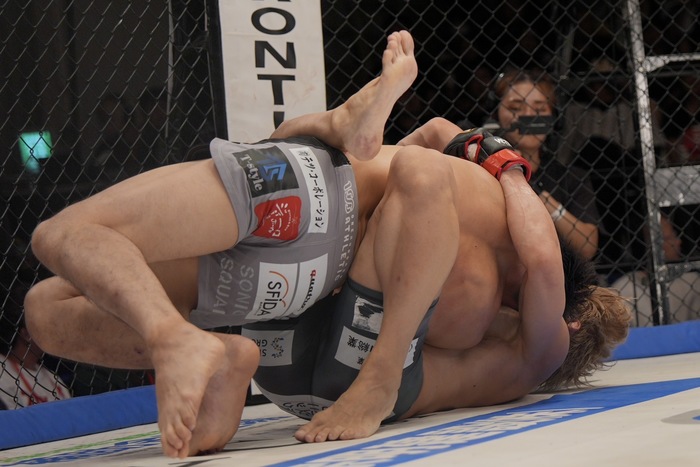 1R、サウスポーの五明に関はオーソドックス。距離を詰める五明。関は前に詰めると右をヒット。効いて膝を着いた五明のバックに回った関が右のパウンドを連打する。立ち上がりケージ際まで移動した五明。バックにつこうとする関だが、五明は正対すると離れた。また間合いを詰める五明。関はケージ際をサークリングする。