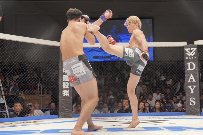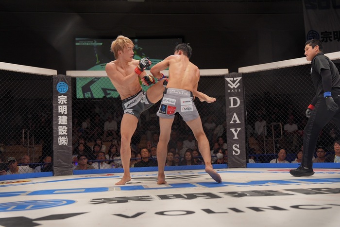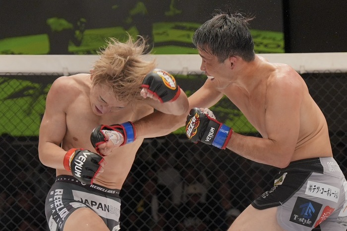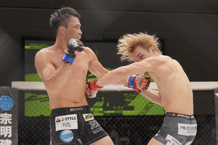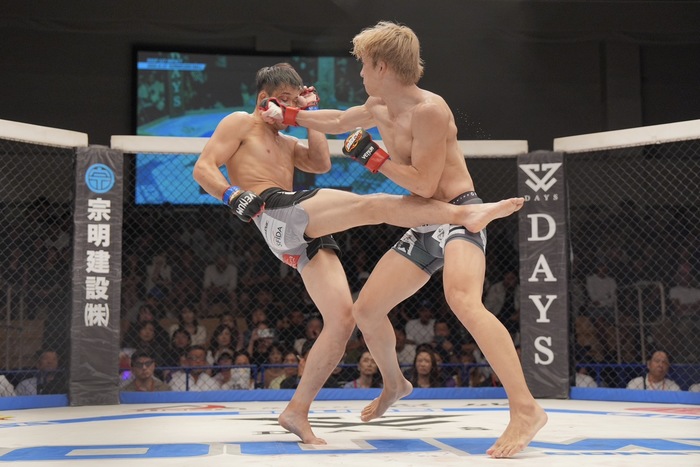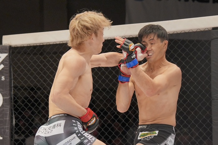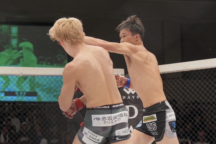 五明が詰める。テンカオに合わせて関がシングルレッグに入るとそのままボディロックしスタンドバックに。正対して離れた五明。残り1分。左で飛び込んだ五明に関も右フックをヒット。ワンツーで出た五明に関もワンツーを返した。2R終了。