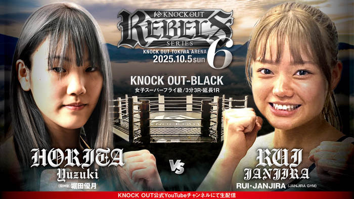 女子キックボクシングの未来を担うと期待されている2人が揃って登場する。KNOCK OUT-BLACK女子スーパーフライ級3分3R延長1Rで堀田優月(闘神塾)vs.RUI・JANJIRA(Team JANJIRA)、KNOCK OUT-BLACK女子バンタム級3分3R延長1Rで珠璃(闘神塾)vs.真秀鷹虎センチャイジム(センチャイムエタイジム)が決定。