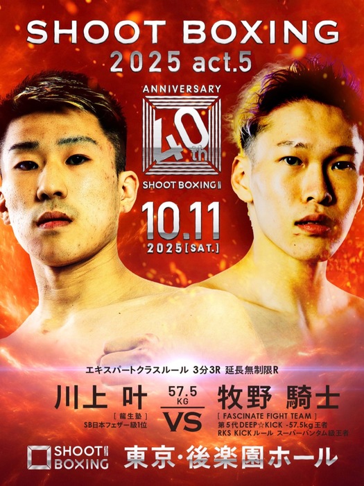さらに『創設40周年記念大会』で行われる「S-cupフェザー級世界トーナメント」に向けて、川上叶(龍生塾)vs.牧野騎士(FASCINATE FIGHT TEAM)による最終選考試合が組まれた。