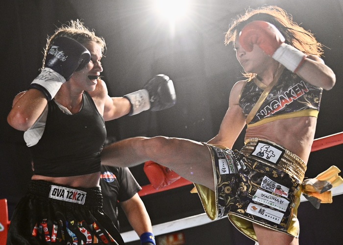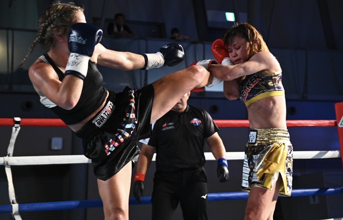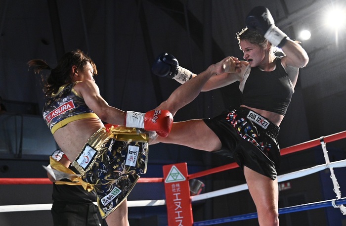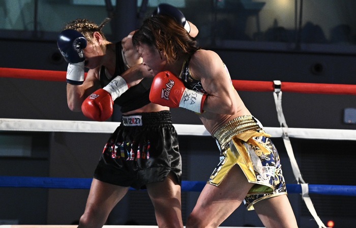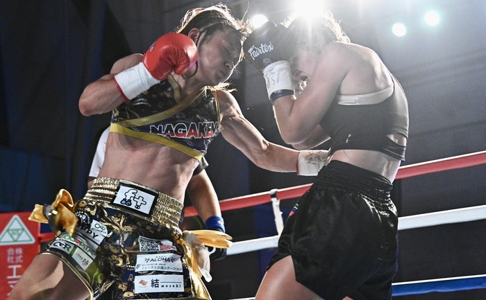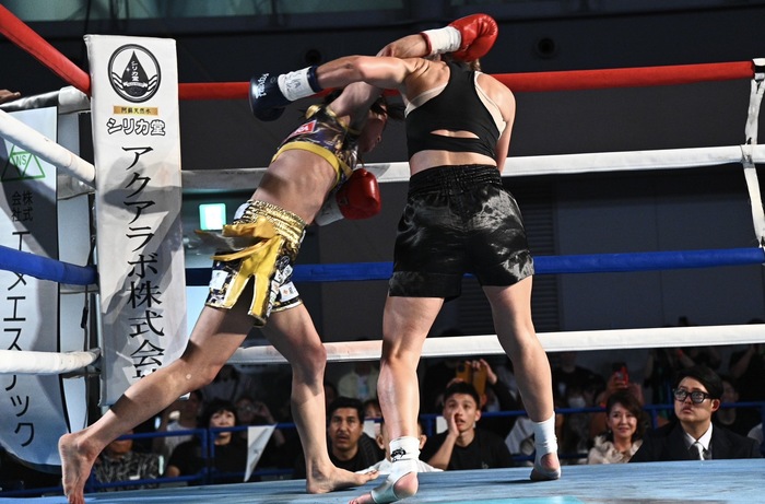 コーナーで笑みを浮かべるMISAKI。2R、エグの左右ロー&ミドルにMISAKIは飛び込んでのワンツー。MISAKIが入って来るところを右ミドルと前蹴りで迎え撃つ。首相撲からヒザの蹴り合い。ブレイクになるとMISAKIが右カーフからの左フックをヒット。すぐに組み付くエグ。